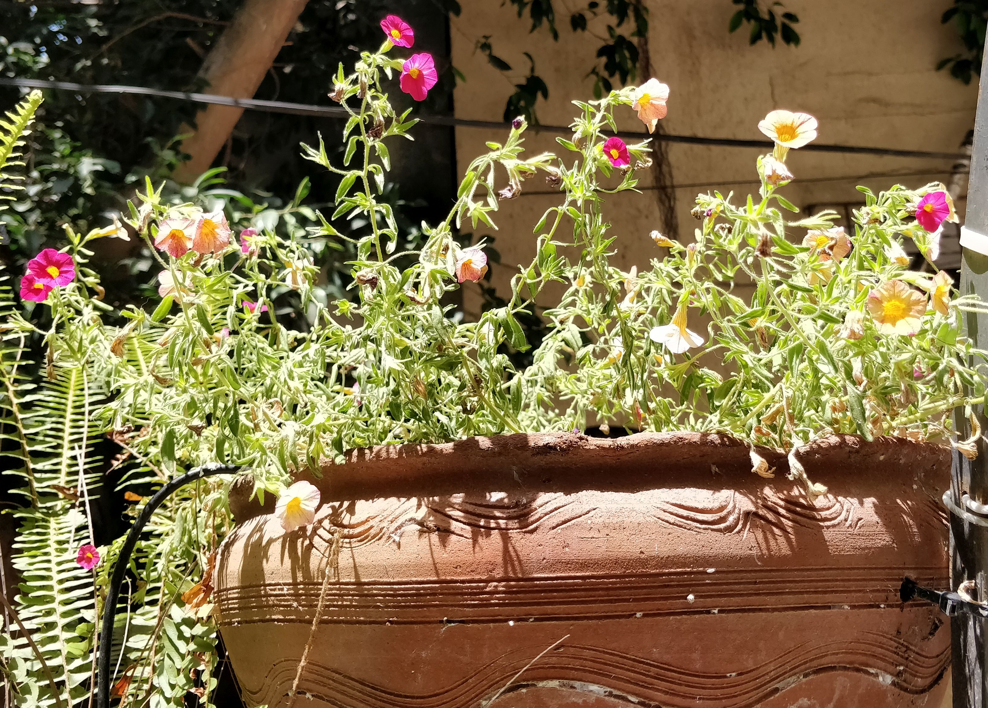 יש לי בחצר עציץ עם הפרחים שבתמונה המצורפת (לצערי שכחתח את שמם). אחרי מספר שבועות שבהם הכל נראה בסדר, בימים האחרונים הצמח כולו נראה לא טוב. האדמה לחה כל הזמן. מקבל שמש 4-5 שעות ביום. צמח דומה הנמצא במיקום אחר ומקבל שמש רק כשעה ביום, הפריחה אמנם מצומצמת, אבל הצמח נראה בריא עם צבע טוב ועם טורגור יפה.