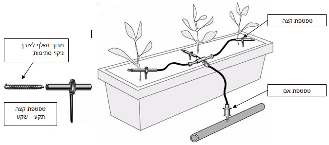 תערובת השתילה מתייבשת מהר יותר מאדמה, לכן יש לשאוף להרטבה מלאה של התערובת באמצעות ריבוי טפטפות במיכל השתילה.* יש ליצור הרטבה מלאה, באמצעות טפטפת כל 15 ס"מ.
