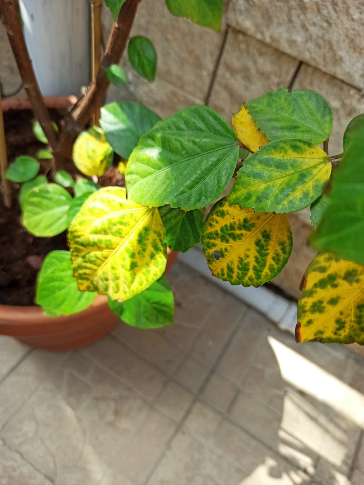 לאחרונה החלו עלי ההיביסקוס ששתול במיכל גדול להצהיב.