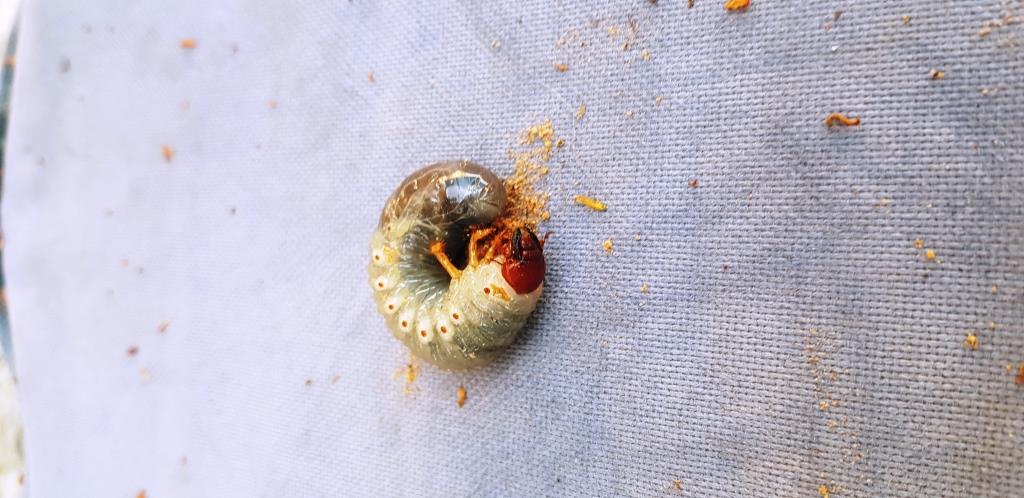 זחל של זיבלית. זחלים אלו מכרסמים שורשי הדשא והורגים אותו.