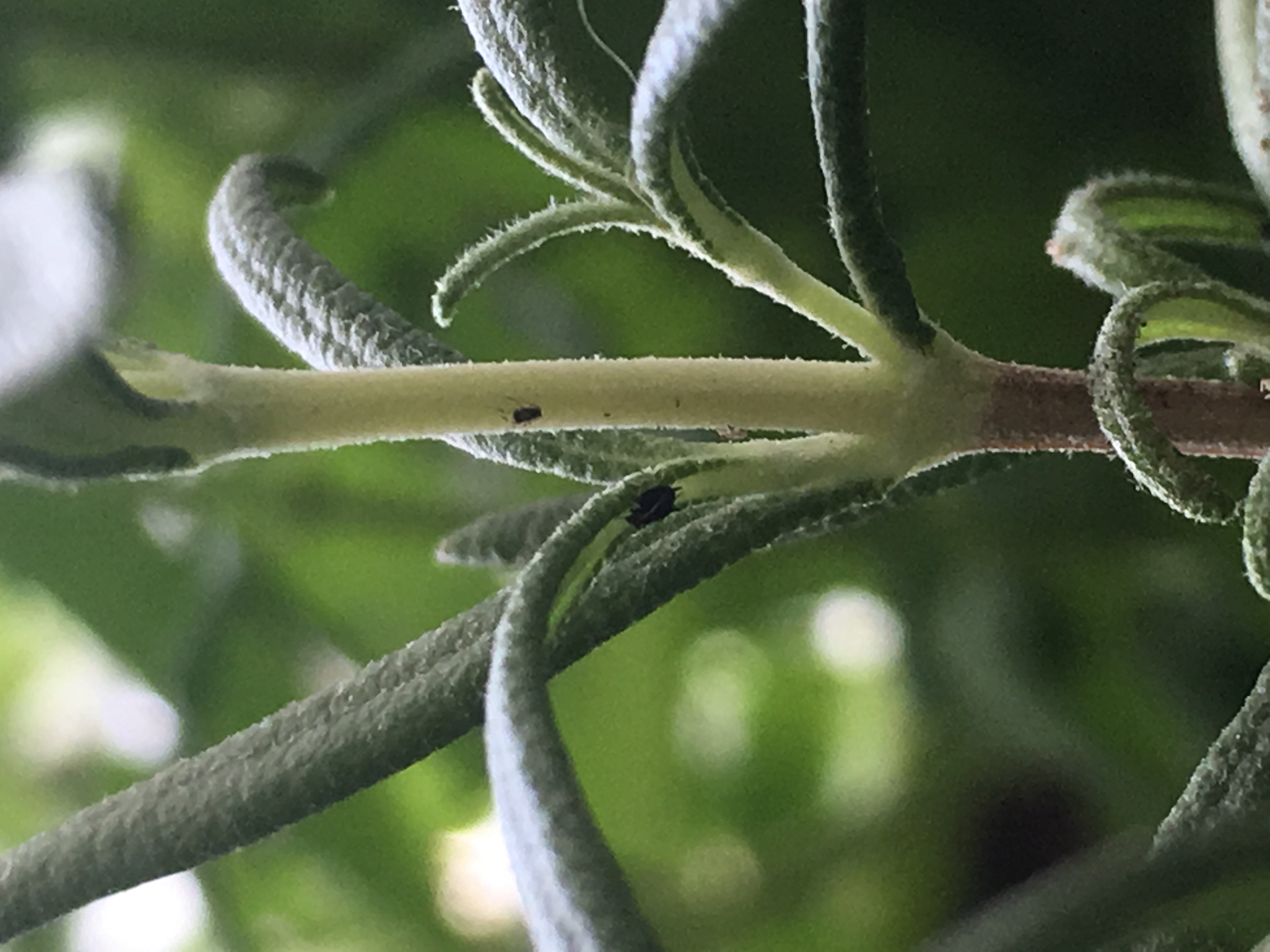 1. בחיבור של עלי הרוזמרין וגבעול קיימות נקודות שחורות הנראה כמו כנימות (נראות כמו חיה קטנה עם רגליים).