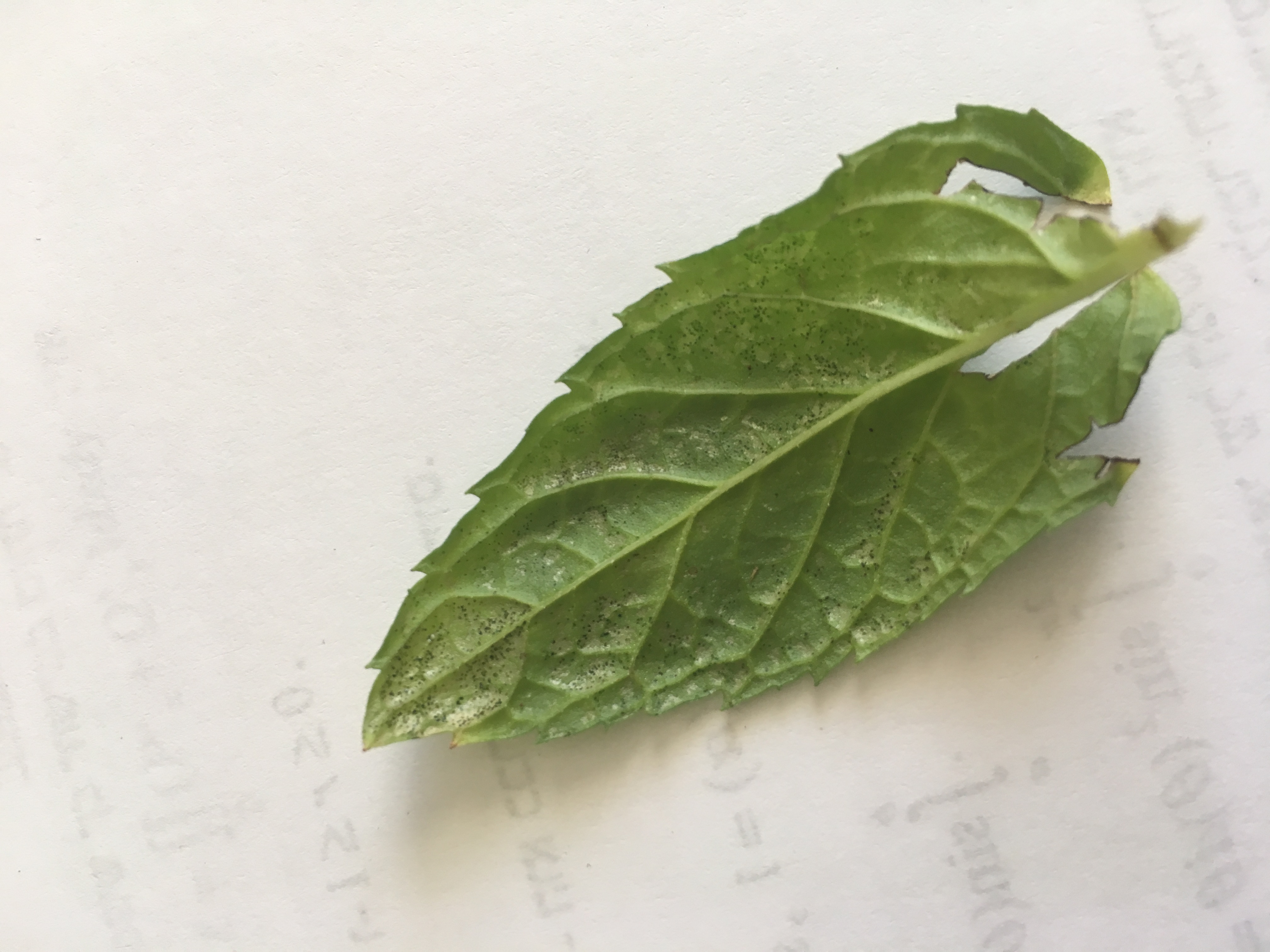 2. על עלי הנענע והלואיזה הופיעו נקודות שחורות קטנות ממש. הוא לא נראות כמו חרקים וגם לא יורדות כשנוגעים בהן, זה כאילו הן חלק מהעלה.