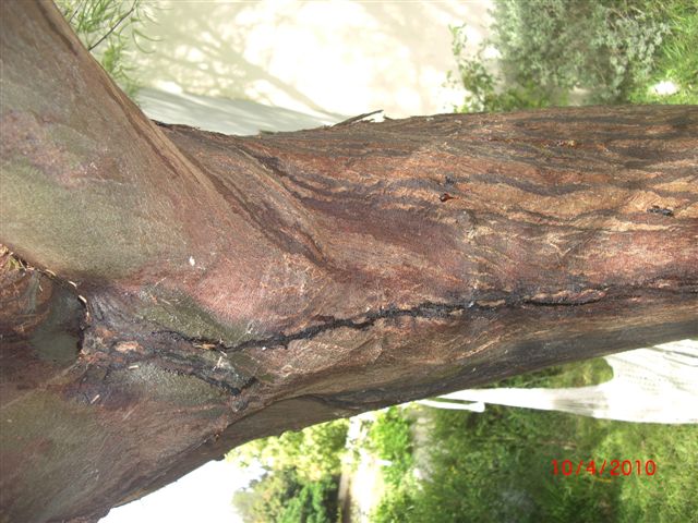 "זו תופעה טבעית לחלוטין ואינך יכול להפסיק אותה מבלי להשמיד את העץ. כנראה שאצלכם נשתל הזן Prosopis juliflora torreyana המכונה "מסקיט הדבש" או "מסקיט הגומי" ולו עוד שמות אחרים. בקיץ ובחורף נוזל מגזע העץ מעין שרף בכמויות שבין 100 ל- 150 ליטר לכל עץ. מעץ צעיר נוזל חומר שקוף למדי, אך עם ההתבגרות הצבע נוטה להיות כהה יותר ויותר, בין דבש לשחור כמעט. לנוזל הגומי הזה שימושים רפואיים רבים וגם שימוש כמזון מסורתי לאנדיאנים, וכיום בתעשיית המזון (ממתקים). מכיל סוכרים שונים ולפחות עשרה תרכובות בעלות משמעות רפואית מוכחת. מתרמילי הזרעים הילידים מכינים (ע"י בישול במים) סירופ מתוק וסמיך כדבש וגם תחליף לקפה מהזרעים. התרמילים מכילים 30% סוכר ענבים. בכלל, לעץ תכונות מופלאות רבות וכמעט כל חלק בו שמיש לאדם. עוד פרטים ראה בתשובה לאימי שופן מיום 18/12/2003 בפורום עצי נוי, וכן הרבה תשובות נוספות בפורומים השונים. ההקלה היחידה שניתן להציע לכם היא "לפצוע" את העץ בגזע התחתון, בחתכים לתקוע מעין מרזב קטן ועליו לתלות דלי לאיסוף החומר. למי שמכיר, זו בדיוק הפעולה שעושים בצפון אמריקה לאיסוף המוהל מאדר הסוכר (Sugar Maple) בסביבות אמצע פברואר. ע"י איסוף המוהל מסביבת הגזע ישתחרר הלחץ על הגדמים והטיפטוף על העובדים במקום, יש לקוות, יפסק."