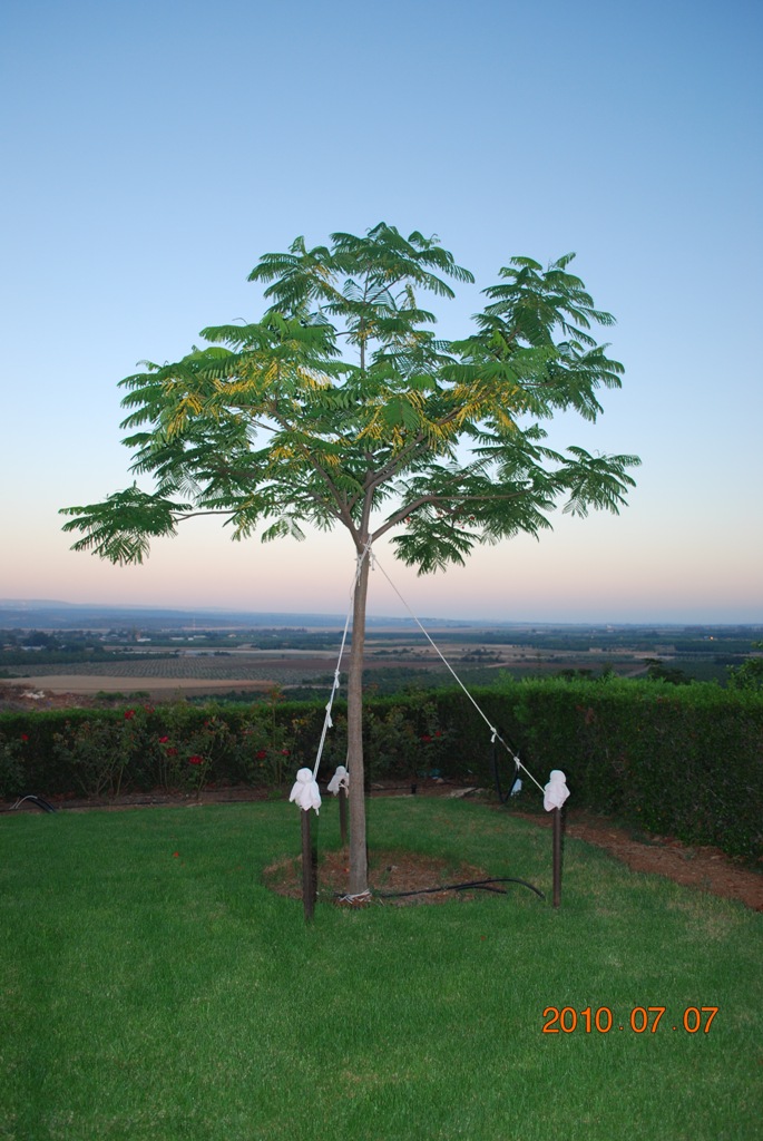 3. שיטת השקייה - מושקה רק ע"י הממטירות של הדשא - 25 דקות, 4 ממטירים בכל פינה במדשאה - פעם בשבוע. אני יודע שמייד תתנפלו עלי ותגידו שחייבים להשקות יותר - אבל שימו לב : הדשא מסביב לעץ ירוק ובריא.... הקרקע היא קרקע כבדה מאוד (בעומק כחצי מטר), ומתחתיה שכבת קרקע לבנה מאוד החוסמת מים. בעבר היה במקום זה עץ סיגלון, אשר בנוסף להשקיה מהדשא קיבל השקיה בטיפטוף, והוא מת מעודף מים - בוודאות - כאשר חפרתי להוציא את שרידיו גיליתי כי עומק הקרקע בוצי ... בנוסף, בקרבת מקום - כ 100 מטרים מעץ זה - (בגינות של השכנים...) - שתולים עצים דומים אשר מושקים אף הם באותה הצורה (השקיית הדשא בלבד, ללא השקיית עזר) והם משגשגים וגדלים מהר מאוד, בקצב מעורר השתאות.