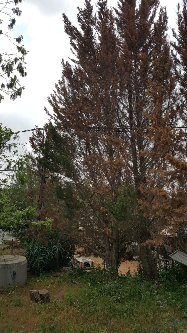 בחצר הבית אליו נכנסנו לאחרונה 3 עצי ברוש גבוהים ויבשים כמעט לחלוטין.
