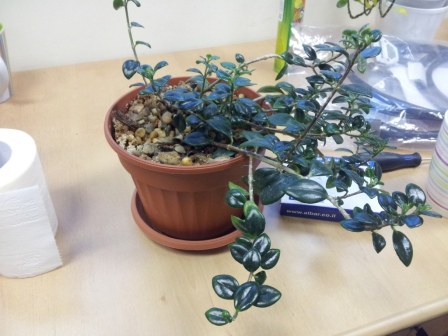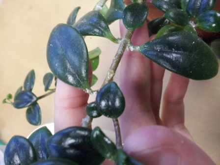 בהנחה שאינך עובדת בנין וכיו"ב, או חקלאית העובדת בשטח, נראה לי שהעציצים בהם מדובר שוכנים בתוך מבנה כלשהו. אם אכן כך, האפשרות של ציקדות נראית לי רחוקה עד לא ריאלית. האפשרות היותר סבירה היא שמדובר בתטולה (שקיקי ביצים) של כנימה, אולי כנימה קמחית. כנימה זו מטילה את ביציה בחלק האחורי של העלה, כדי להסתיר אותן מפני עינא בישא (טורפים למיניהם), והיא מפרישה עימם ריר דביק כדי שישארו דבוקים לעלה. מהביצים בוקעות רימות אשר מיד מתחילות להיזון ממוהל הצמח המצוי בעלים.
