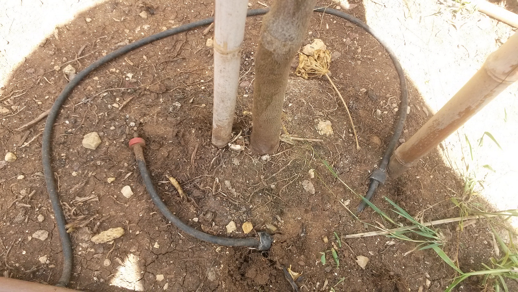 מבחינת השקייה, לכל עץ קטן יש צינור נפרד עם 3 טפטפות כמו בתמונה.