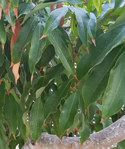 מצ"ב תמונה של עלים של ליטשי שהקצוות שלהם שחורים.