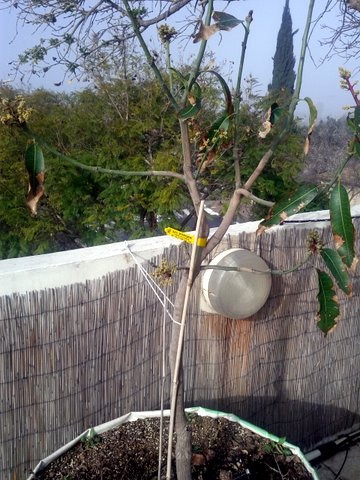 שלום, יש לי עץ מנגו במרפסת שיש על העלים שלו כתמים חומים גדולים ורוב העלים כבר נשרו, התחילה פריחה ברוב העץ אבל ללא עלים, מצורפת תמונה, מה ניתן לעשות ע"מ להציל את העץ?