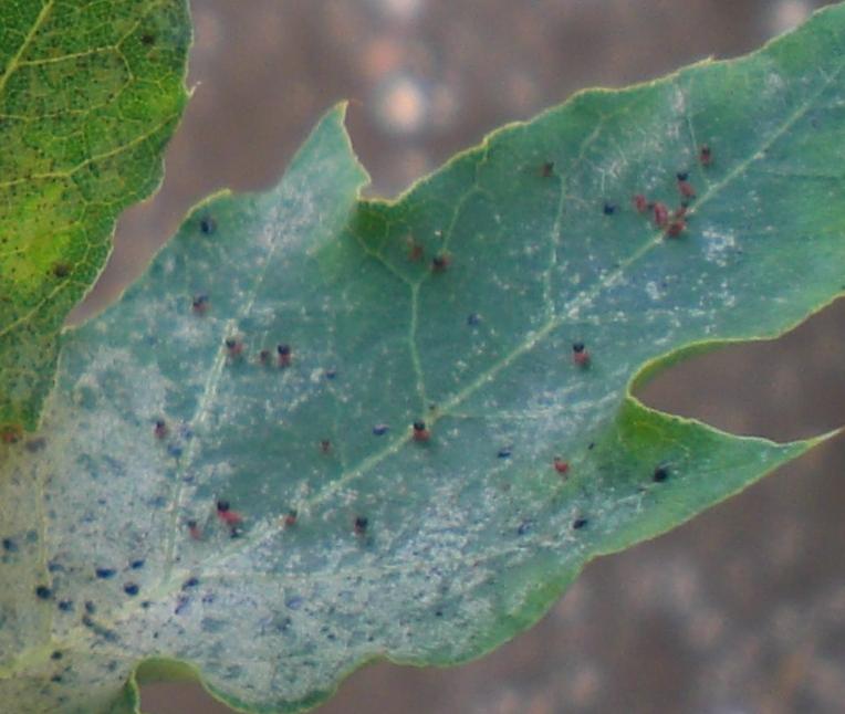 העלים הנגועים מקבלים גוון לבנבן (כאילו מים עם אבנית התייבש על העלה)