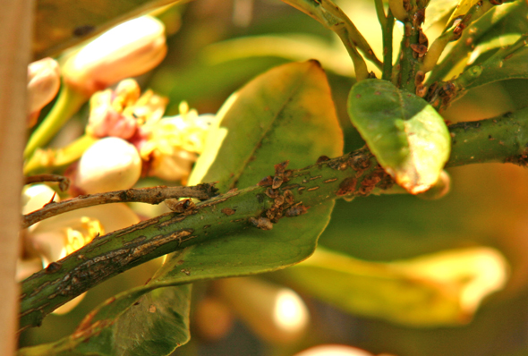 הכי נורא הוא מצבו של הברגמו על חלק מענפיו ועליו צמודות כנימות רכות עם המוני נמלים שעולות ויורדות בגזע, כנראה על מנת לאסוף את טל הדבש. בנוסף לכך הפריחה בעיצומה, דבורים מזמזמות ועושות את מלאכתן. עדיין אין פרי, חלק מהפרחים פתוחים וחלק סגורים עדיין.