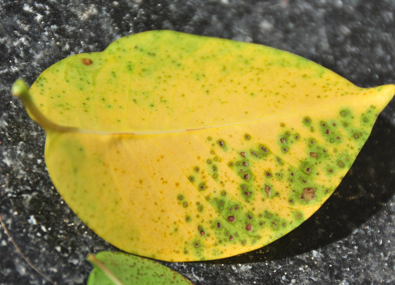 יש לי צמח דיפלדניה שלאחרונה העלים שלו החלו להצהיב ולנשור. כשהסתכלתי מקרוב ראתי בעלים מלא נקודות קטנטנות. אני לא מצליחה לזהות כנימה כלשהי שם, ולכן חשבתי שאולי מדובר במשהו אחר.