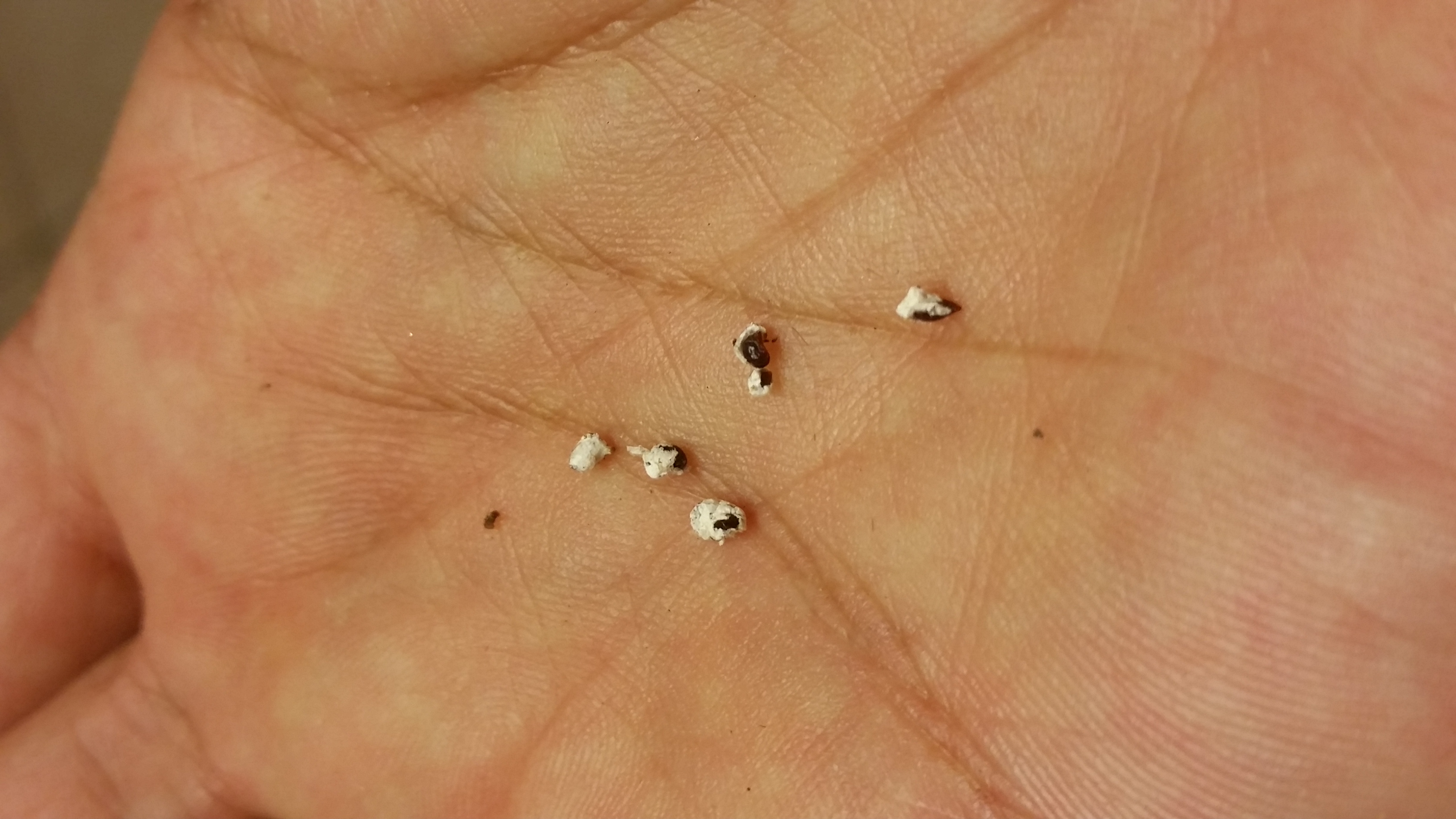 אפשר להסיר את החלק הלבן שנראה כמו מרמשלו או צמר גפן ונשאר משהו חום בגודל חצי ממ עד 2 ממ. נמעך בצבע חום