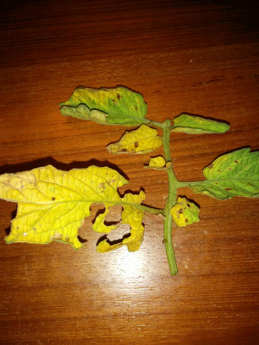 אחרי היעדרות של שבועיים וחצי מהבית, גיליתי נזקים בכמחצית מעלי צמחי העגבניה שבגינה: שילוב של סימני כרסום העלים , כתמים חומים וצבע צהוב מתפשט. מצורף צילום.