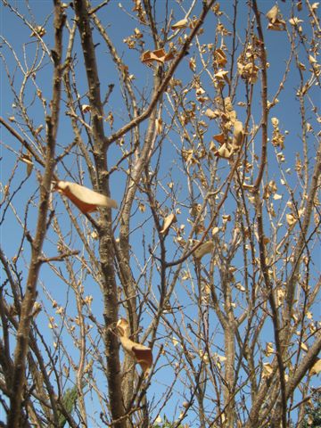 צר לי למסור לך כי קרוב לודאי שהעץ סיים את תפקידו. אם הוא לא מת ממש עדיין, זה יקרה בתקופה הקרובה וכבר מאוחר מדי להציע טיפול. היית צריך לפנות כאשר הבחנת שמשהו אינו כשורה עם העלווה. העץ נפגע ככל הנראה על ידי פטריה בשם Eutypa lata הגורמת לתופעה המכונה מות היוטיפה. יש סיכוי מה שהפגיעה היא משולבת פטריתית-בקטריאלית, על-ידי הבקטריה Pseudomonas syringae, למרות שזה מעט מאוחר בעונה עבור הפעילות של בקטריה זו. יתכן אף שהפגיעה היא של הבקטריה בלבד, קשה לומר בלי בדיקת מעבדה כיון שהסימפטומים של שני פתוגנים אלה דומים. האם גזמת את ענפי/זמורות העץ סמוך למועד בו הבחנת בכך שהעלווה לא נראית טוב?