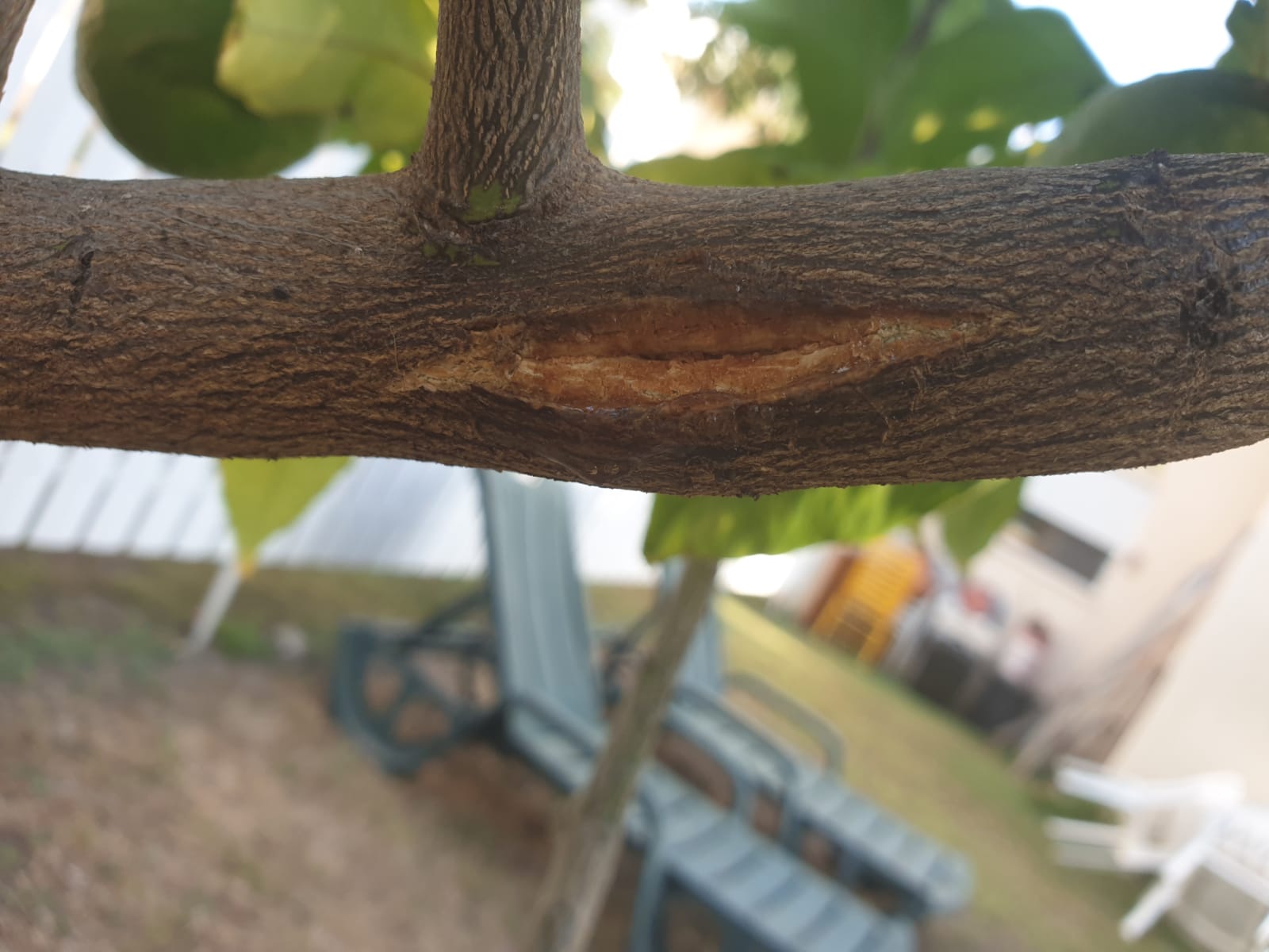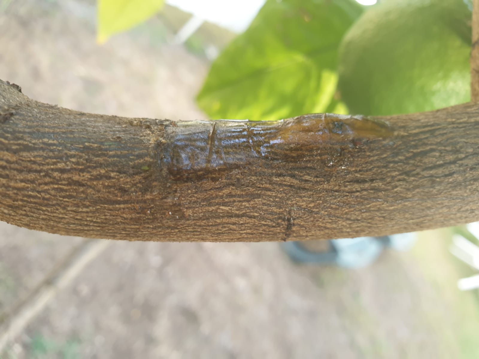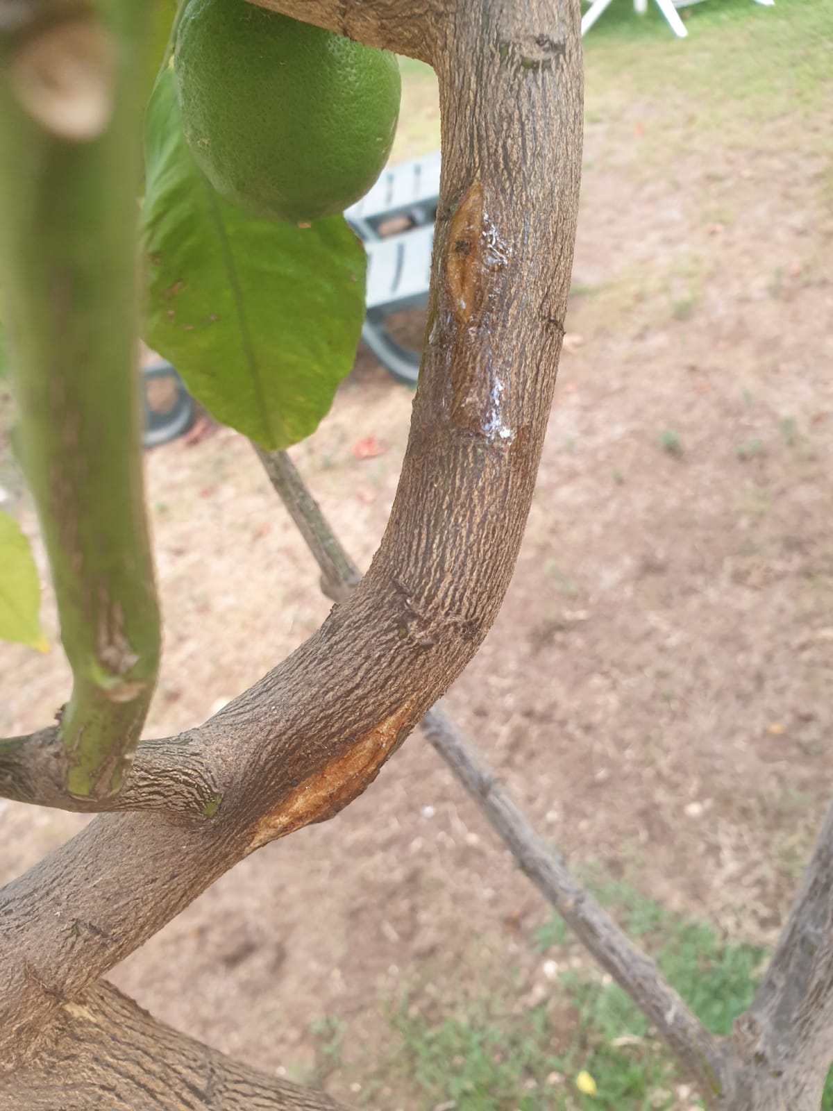 על עץ לימון בגינה הופיעה התנפחות שמלווה בהפרשות מתוך העץ בחומר מבריק שנראה כמו שרף (אם כי אני לא בטוח). זה מופיע על ענף אחד בלבד, ובאיזור מאוד ספציפי כפי שמתואר בתמונה. במה מדובר?
