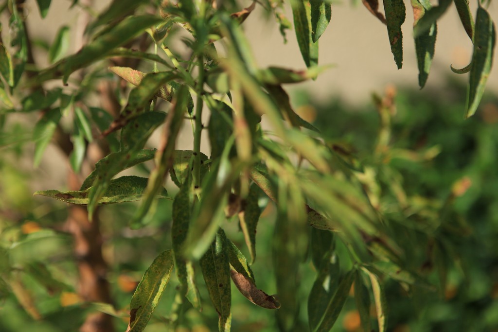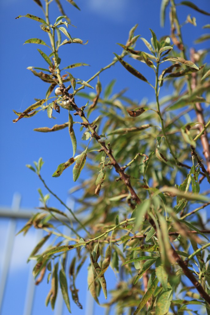 שקדים גם בטבע נראים לפעמים כך בקיץ.תוספת השקיה של 50 עד 100 ליטר לשבוע ישנו את המצב לטובה