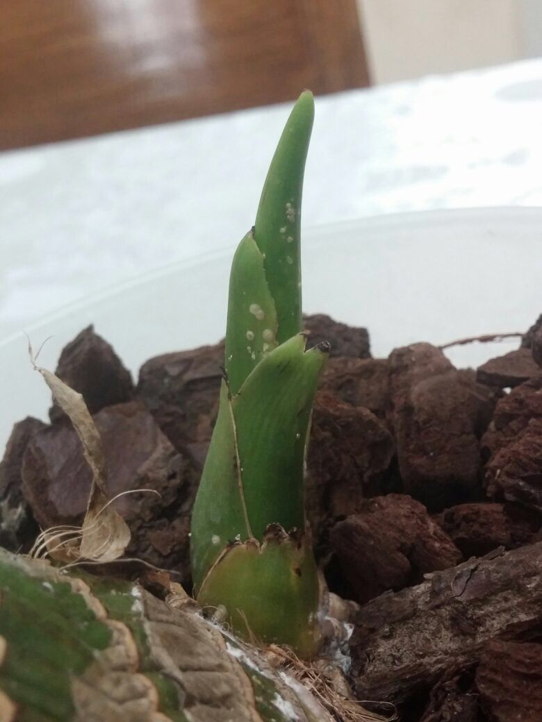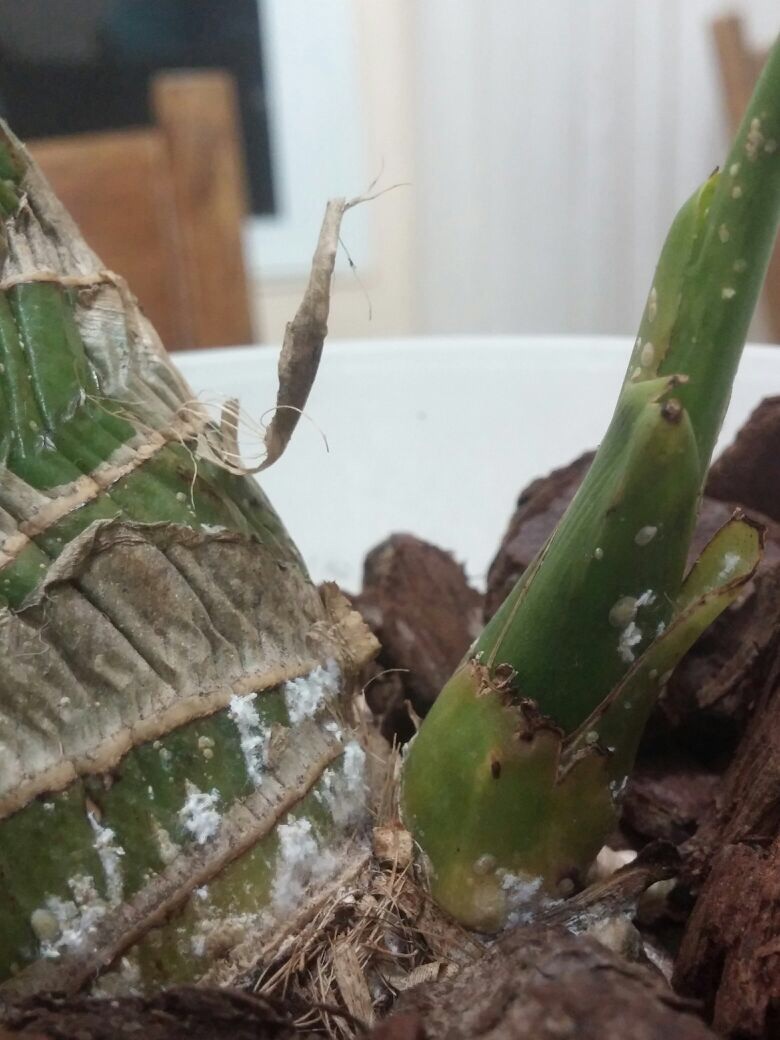 הסתכלתי עליו היום ואני חושבת שהוא חולה מאוד. כולו מכוסה באבקה לבנה שבהתחלה חשבתי שזו אבקת ההשרשה ששמתי לו לפני חודש. אך משום מה היא לא נעלמה עם המים. כמו כן היא מכסה חלקים נרחבים מהפקעת שבהם לא מרחתי אותה כלל.