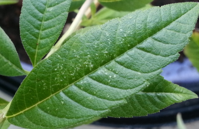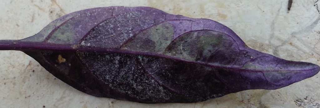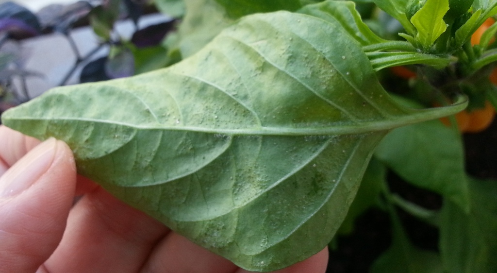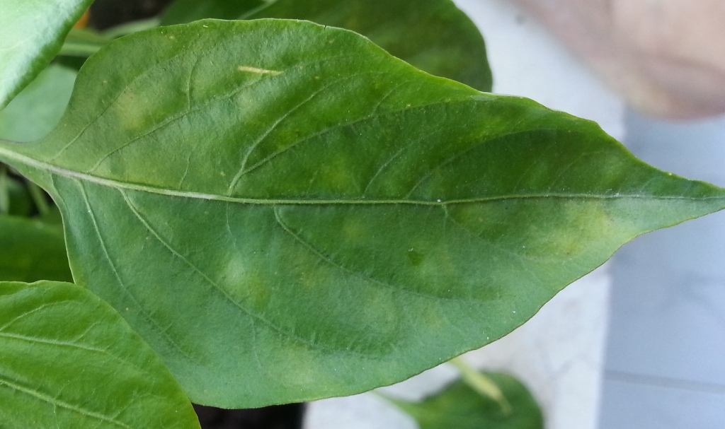 פלפלת מתוקה - בצידם התחתון של העלים סוג של נקודות בולטות קטנטנות וצדם העליון נראה כאילו מפתח כתמים בהירים גדולים