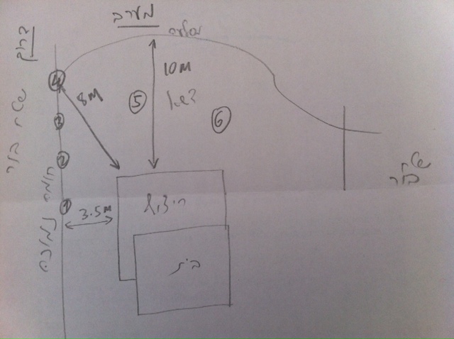 מצ״ב הגינה. המספרים מייצגים את המקומות שאני השבוע רוצה לשתול את העצים הבאים. המרחקים הם המרחקים מהריצוף (בית או פרגולה) הקרובים ביותר