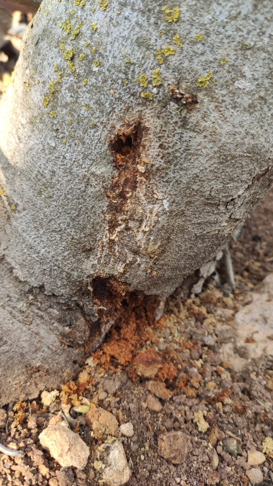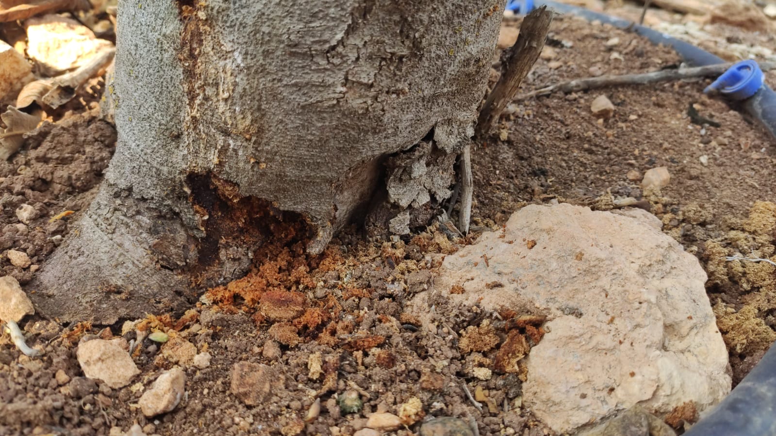 גזע העץ תאנה נראה כאילו נאכל בתחתית, בנוסף יש חור קטן בגזע