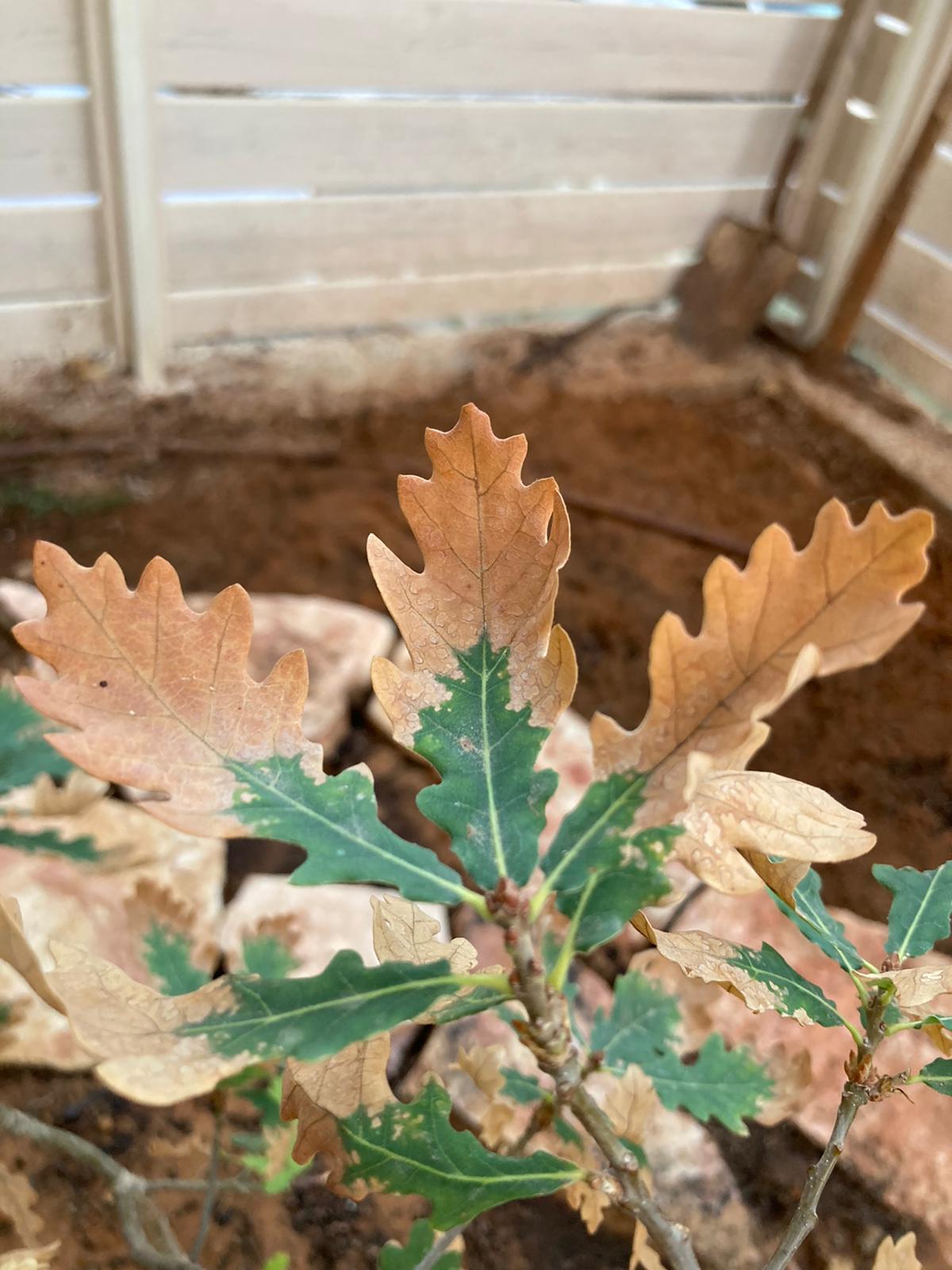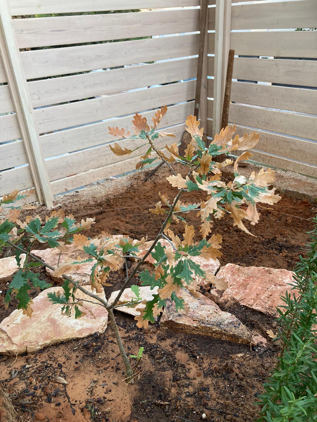 בחצרי עץ אלון קטנטן (שקיבלנו בעציץ והעברנו לאדמה)- שלאחרונה העלים שלו נראים מיובשים (מצורפות תמונות).