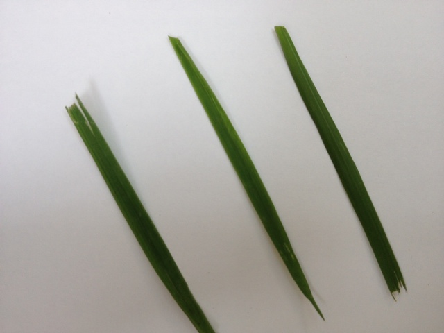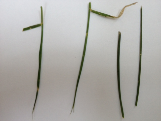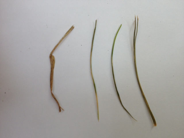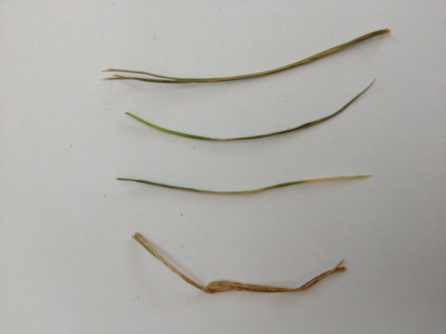 הרעיון לצרף תמונות עלים הוא נכון אבל, לצערי, הביצוע לא טוב. צריך לבחור עלה (ולא קווצה) טיפוסי בודד, לשטח טותו היטב ולצלם אותו משני צידיו, מקרוב ובחדות ככל האפשר. כמו כן צריך לבחור עלה אחד מתוך האזור הפגוע, ועלה נוסף מהגבול שבין האזורים. כדאי אף להוסיף תמונות עלה מתוך השטח הירוק, הלכאורה בריא.
