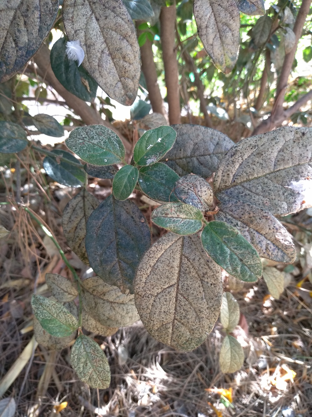 שיח מורן התחיל לסבול מהצטברות נקודות כהות קטנות על ומתחת לעלים. נראה שזה גורם לעלים להתייבש.