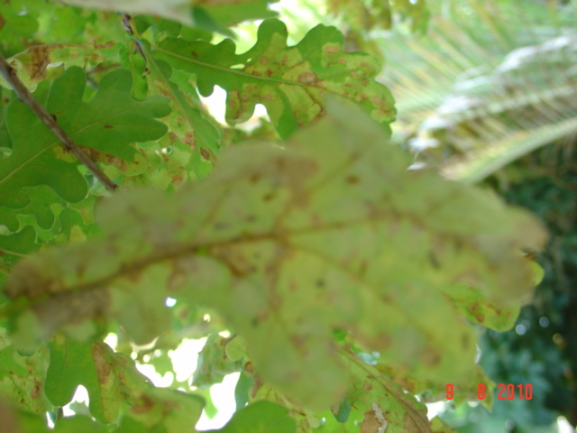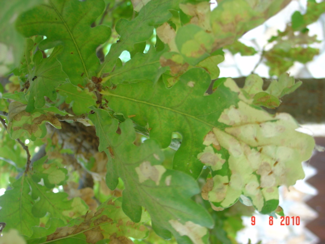 לשאלתך, איני יכול לומר מדוע ואיך זה קרה אבל העץ חולה מאוד. מתמונה כזו בלתי אפשרי כמעט לאבחן את גורם המחלה בוודאות, אבל זו נראית לי פגיעה פטריתית הגורמת לחסימת צינורות ההולכה של נוזלים וחומרי מזון. המחסור באלה גורם לעלה להתחיל לאבד את צבעו הירוק כשהכיוון הוא משפת העלה תחילה אל עבר מרכז העלה. בשלב הראשון הצבע הירוק (כלורופיל) אובד והעלה מלבין. לאחר מכן הוא מצהיב או משחים ונושר לארץ. בדרך הוא עשוי גם להתגלגל/להסתלסל. האם את מבחינה בכל הסימפטומים האלה? אם כן, יתכן שהעץ נפגע על ידי הפטריה Ceratocystis fagacearum. אם אכן זהו הפתוגן, אין תקנה לעץ והוא ימות בתוך זמן קצר יחסית. אלונים רגישים מאוד לגורמי מחלות כאלה וכאשר הם נפגעים, כפי שניתן לראות בתמונה שצרפת, הם מתים בתוך זמן קצר. בכל זאת ספרי לנו בן כמה העץ ומתי הבחנת בפגיעה לראשונה. חשוב שתנסי לוודא אם הסימפטומים שרשמתי לך למעלה אכן קיימים כולם בעלוות העץ. אם כן, חשוב מאוד יהיה להשמיד את העץ בהקדם האפשרי. אם הסימפטומים אינם כפי שציינתי, צלמי וצרפי כאן מספר עלים במופע/דרגת פגיעה שונה וננסה להמשיך את האיבחון. אנמא בדקי גם אם יש ענפים, או זמורות, שעליהם נשרו כבר ברובם, או כולם.