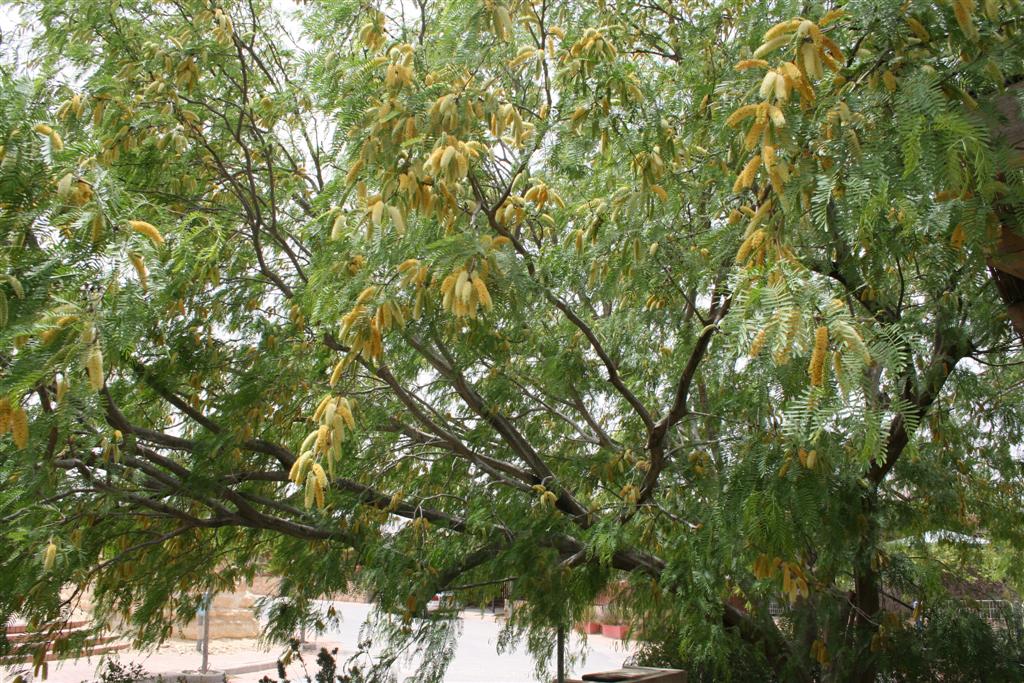 פירותיו בתרמילים מחוררים, כמו חרובים מוזרים, ויש קוצים יחסית גדולים בענפיו.